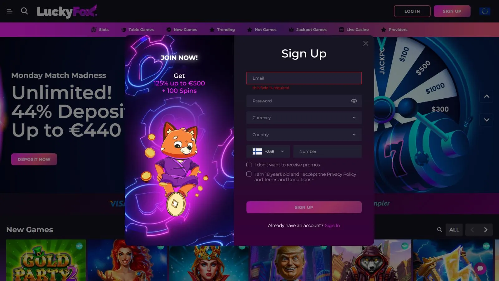 At LuckyFox casino, you can easily navigate the site using the top bar, which includes sections like Online Casino, Promotions, VIP, Loyalty, and Support.