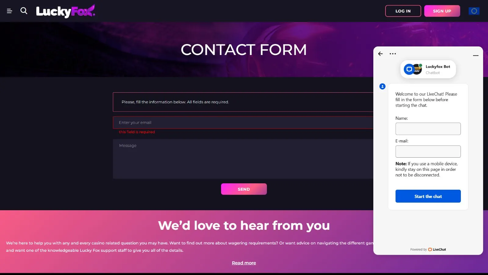 On occasion, you might find yourself in a position where you require assistance while playing at the LuckyFox.io casino. You will have a few different options to choose from in order to get assistance, regardless of the reason you need it. You’ll find more information about them below: