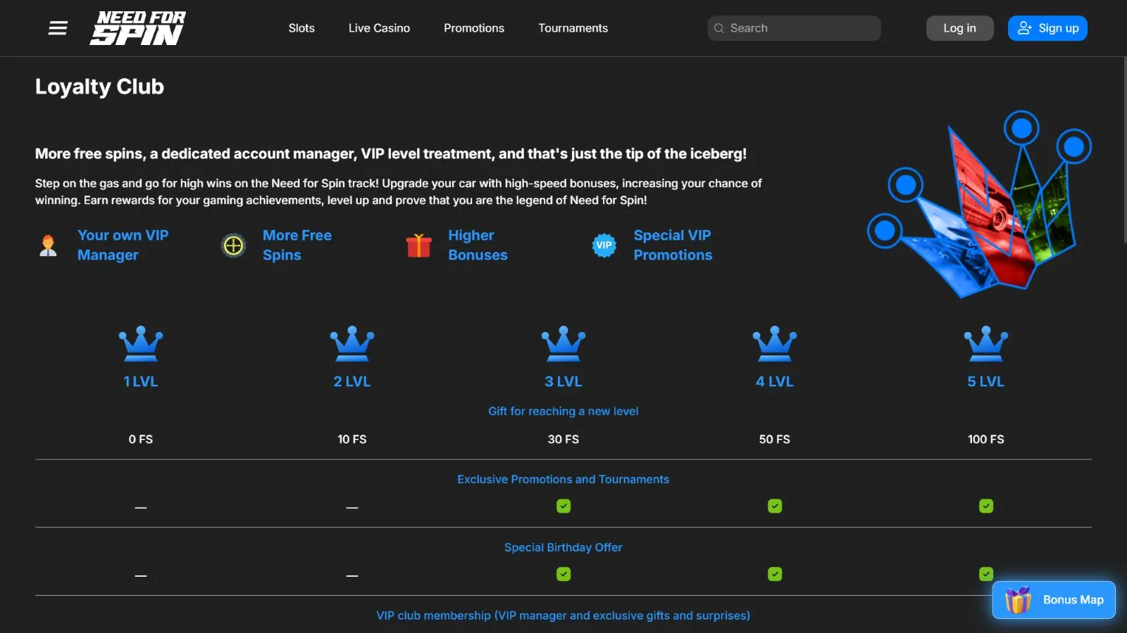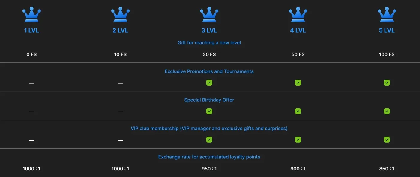 Getting started is easy because when you join, you'll automatically be in level 1, and there are four more levels to attain, making a total of 5. While every new level will unlock unique gifts, some bonuses are reserved for the higher levels. So, to get all that's stored up in the VIP program, make sure to hit the highest level, and your reward will include free spins, exclusive promotions and tournaments, special birthday offers, and others.