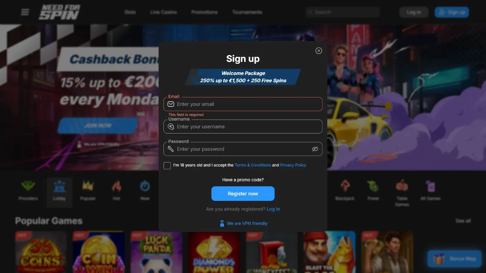 Visit the Need For Spin Casino website on your desktop or mobile device. Click on the blue button at the top right corner of your screen to initiate registration. You'll be asked to enter your email address; then, create a unique username and password and click “Register” to continue.