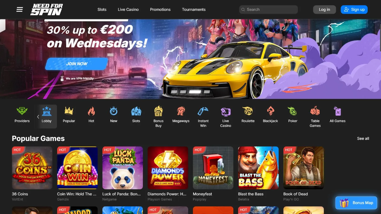 Need For Spin has a Formula 1 racing theme that all its services revolve around. Every game session will pump your adrenaline, making you feel more alive than ever. The site has a black background and a captivating homepage, thanks to the skillful deployment of bright colors like green, yellow, white, and blue in the fonts, cartoons, and icons.