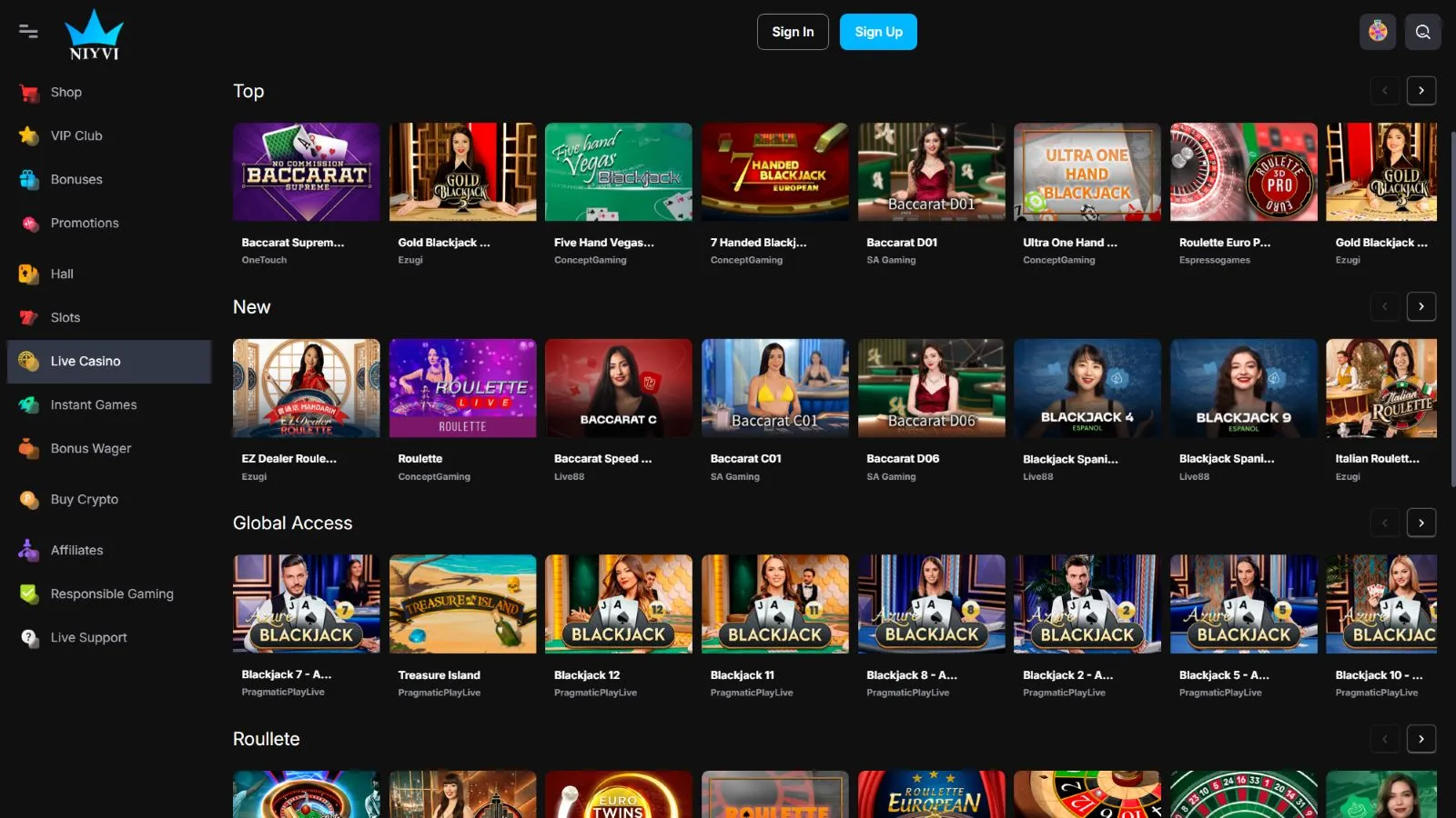 Prepare for a pleasant crypto gambling session at Niyvi Casino, a 2024-established platform with top-quality games, unlimited fast withdrawals, and attractive bonuses. The casino processes payments primarily via cryptocurrencies and lets you make deposits with debit/credit cards.