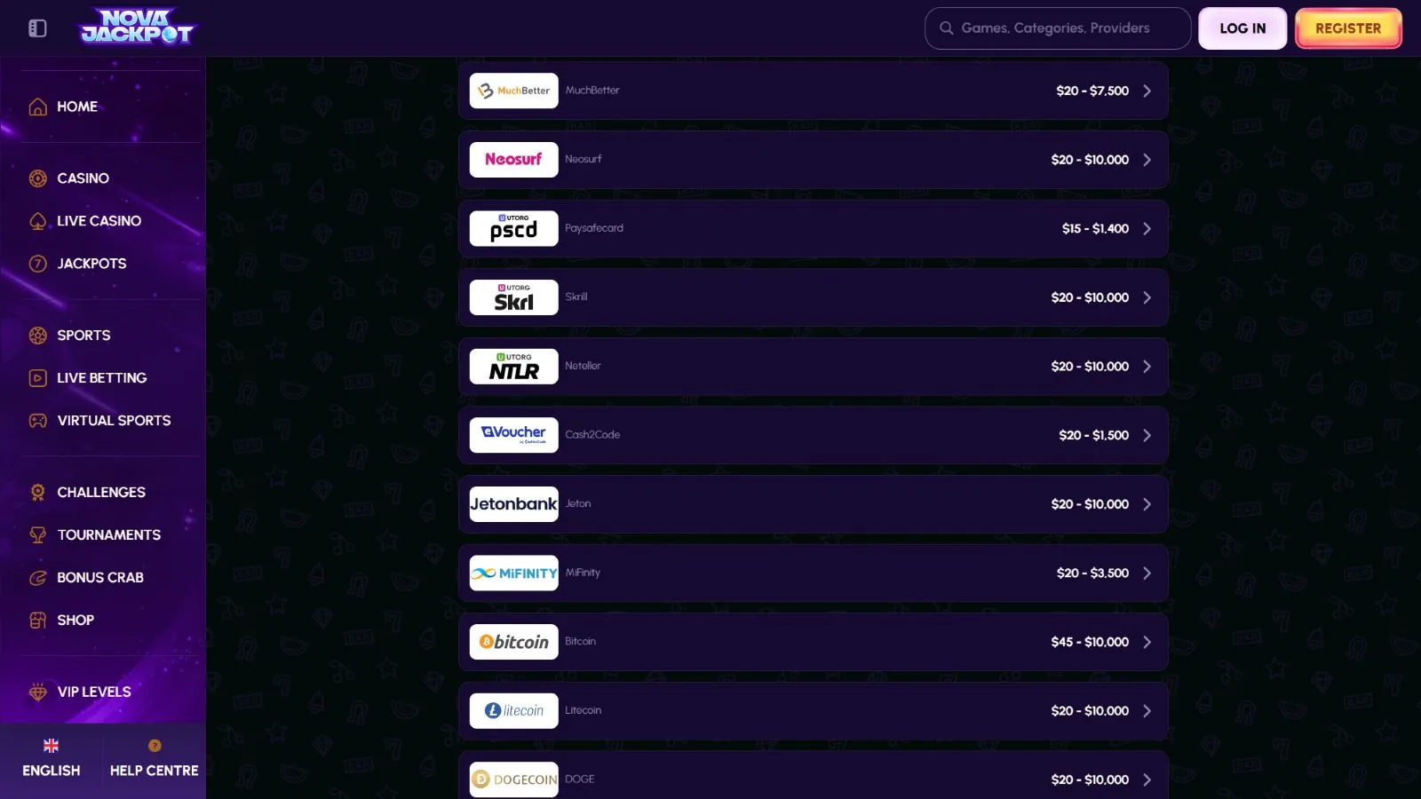 Are you a high roller who wants to push the stake limits to the max? Nova Jackpot has live games to satisfy your cravings for big risks and even bigger potential wins! Head over to the Gold Saloon category!