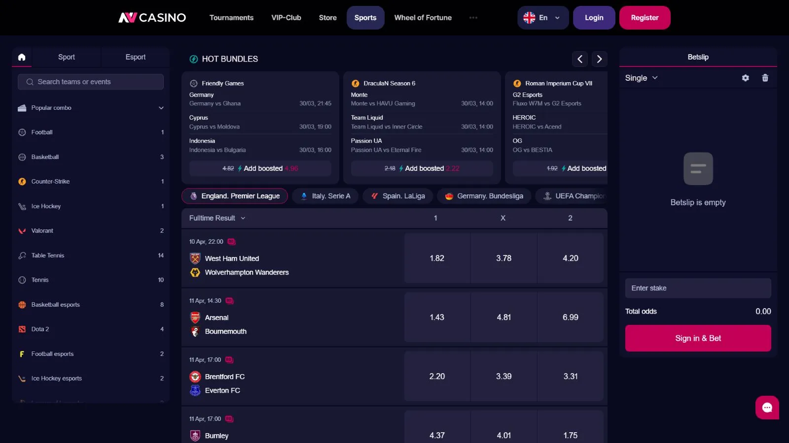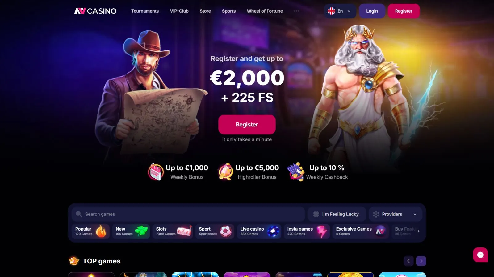 If you prefer to have your welcome party in the sportsbook, the NV Casino offers a bonus of up to €600. It is spread over your first two deposits and must also be activated before you top up.