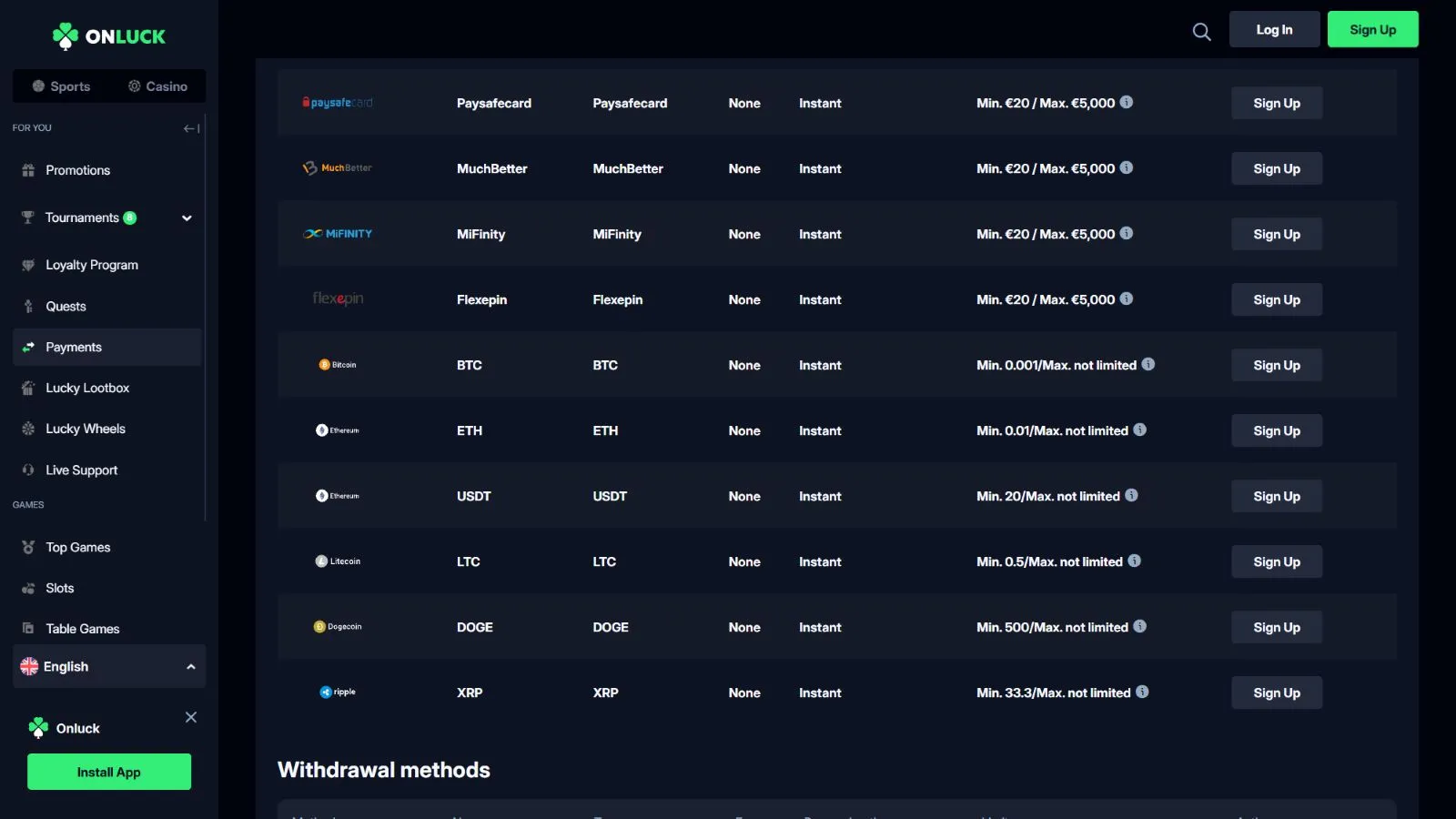 At OnLuck casino, the speed of processing payments is of great importance, as they strive to provide the best possible experience for their players. The casino supports a wide palette of payment methods, including Visa, MiFinity, Jeton, Bitcoin, Ethereum, Tether, and others. OnLuck casino takes every measure to ensure that all transactions are processed as quickly as possible. Deposits made at OnLuck casino are typically processed almost instantaneously, allowing players to dive into their favorite games without delay. As for withdrawals, players can expect to wait up to several hours for most methods. However, when using Visa, the waiting time might extend up to 5 banking days.