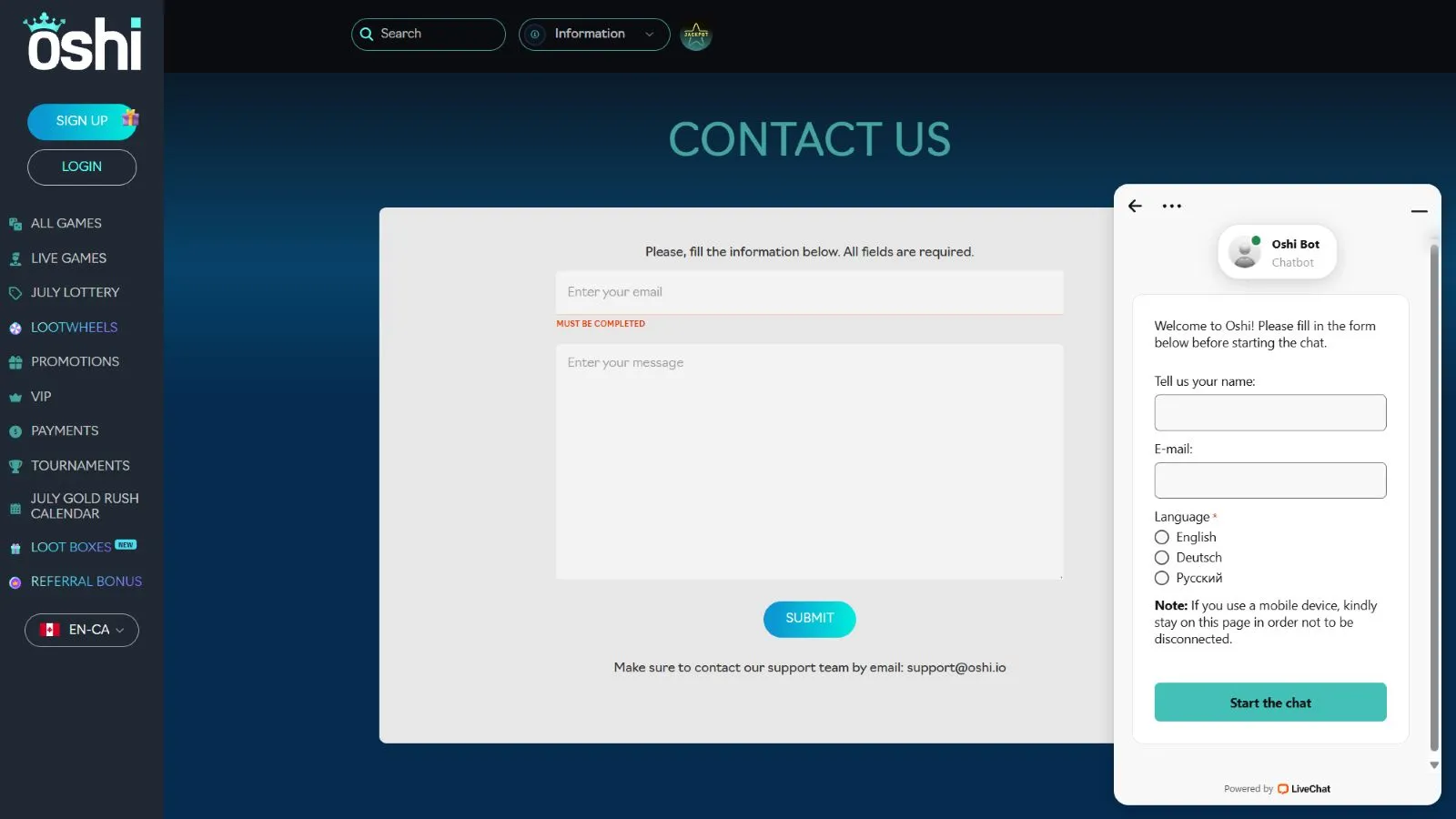 Oshi Casino offers 24/7 customer service via live chat. The Live Chat option is located in the bottom right-hand corner of the screen, and support is available in a number of different languages. For more advanced inquiries, Oshi offers an email address that can be contacted. Unfortunately, Oshi does not offer customer support via telephone.