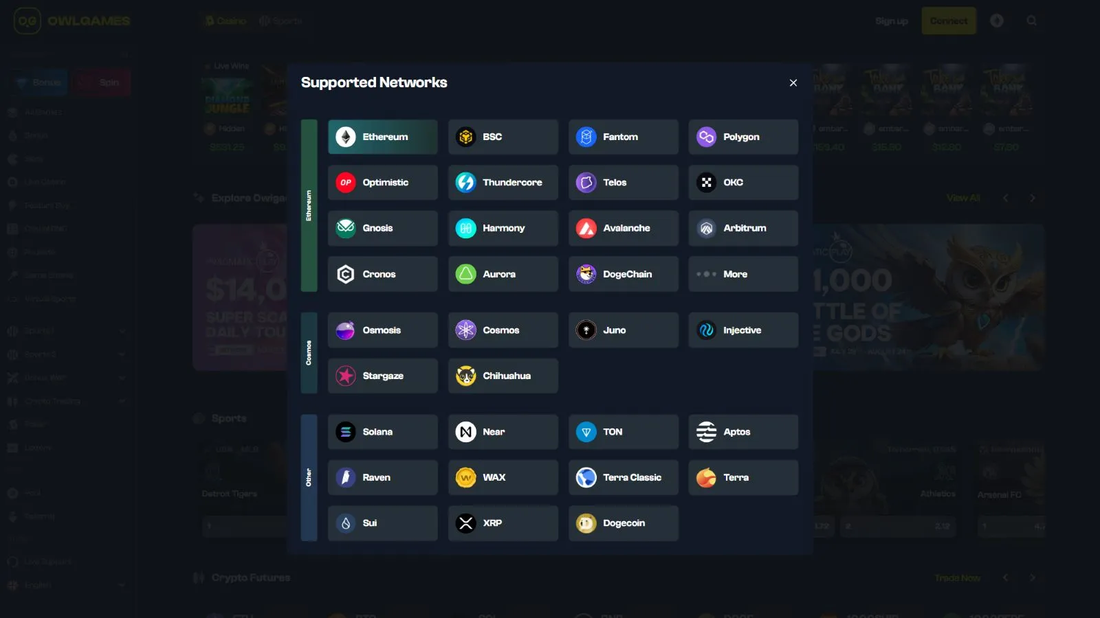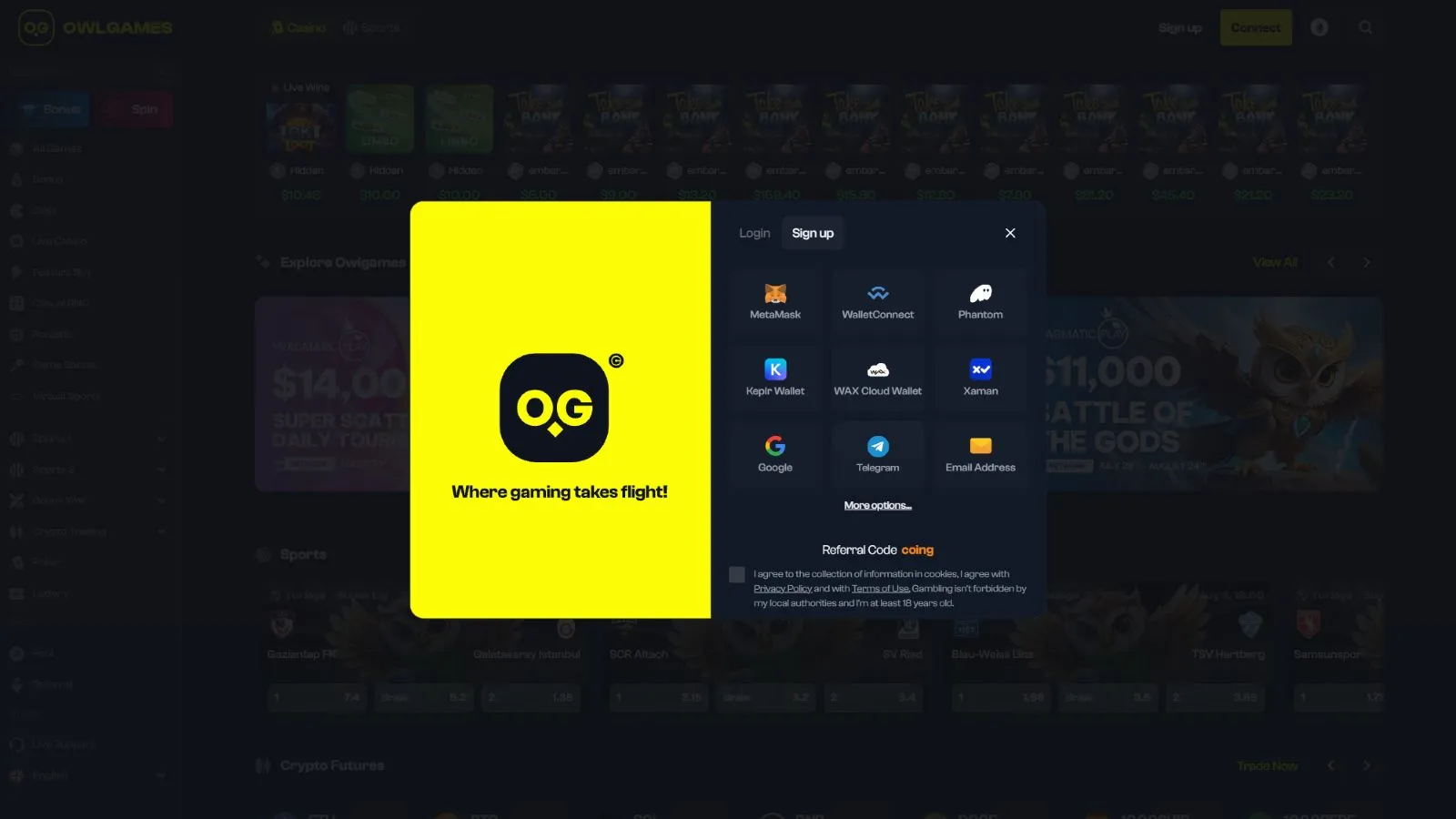 Owl.games is a crypto casino for Web 3.0 and you will notice that in the mere process of the registration of your account. Just click on the blue button “Sign Up”, and you will have the possibility to choose one of the following: