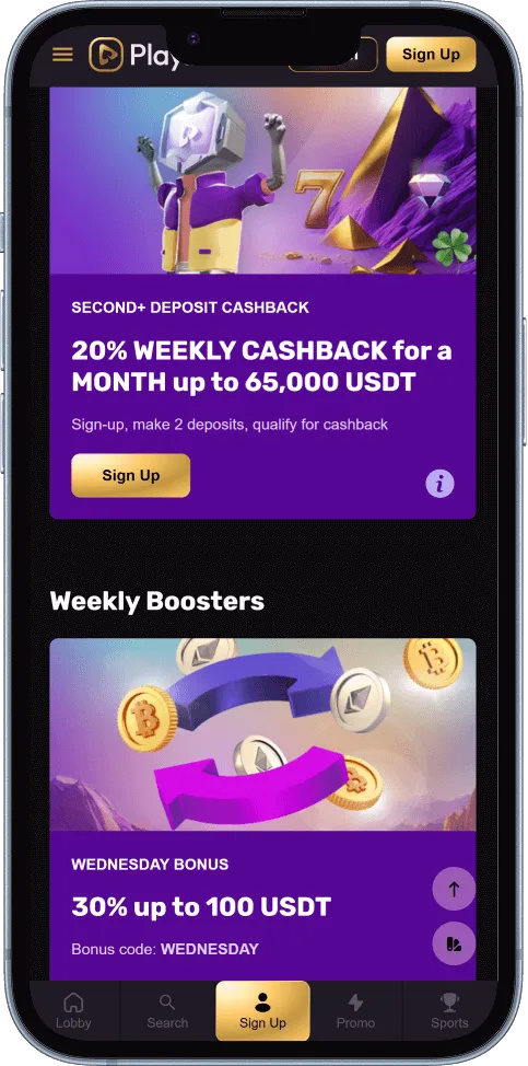 To keep the fun going, the gambling site offers you 30% up to 100 USDT every Wednesday. You only need to deposit a minimum of 20 USDT with the Playbet Casino promo code WEDNESDAY Copied . The bonus lasts for 7 days, within which it must be wagered 45x.