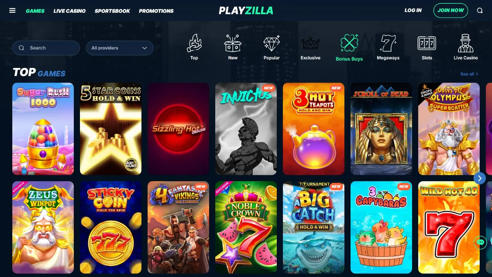 There are thousands of online casino games at Playzilla casino. To find these games, just click on the “Games” tab from the main menu. Then, you will be taken to a screen where you can see many slots and other top-rated games. There, you can choose to filter the games by provider or use any of the many subcategories. These are Top, New, Popular, Slots, Live Casino, Table Games, Jackpots and All Games.