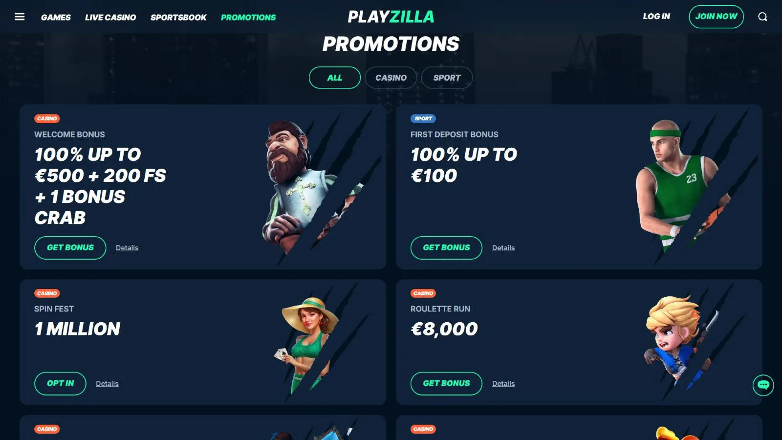 The bonuses at Playzilla, or promotions, are the very best thing that will serve you as a gambling aid in your gambling sessions. On their promotions page, you are going to find welcome bonuses for both casino and sports players, weekly reload bonuses, weekend reload bonuses, cashbacks, sports jackpots, accumulator boosts, virtual sports promotions, and many others. We will discuss each of these promotions in the following sections.