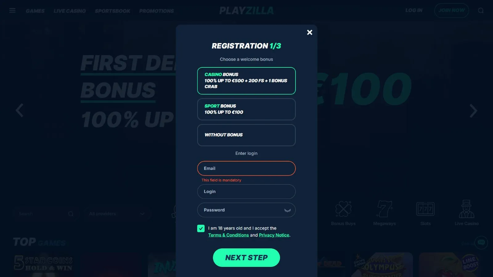 Depending on your playing preferences, at Playzilla, you will have to option to choose between the casino welcome bonus and sports welcome bonus.