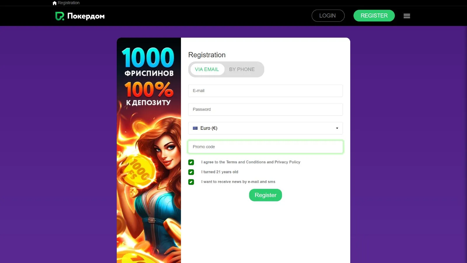 To create an account at PokerDom, you will have to visit their website and click on “Sign Up”. Then, choose one of the registrations like, Google account, Vkontakte, Email addres, and Phone number, and select your currency. Also, keep in mind that before being able to play, you will have to verify your email address.