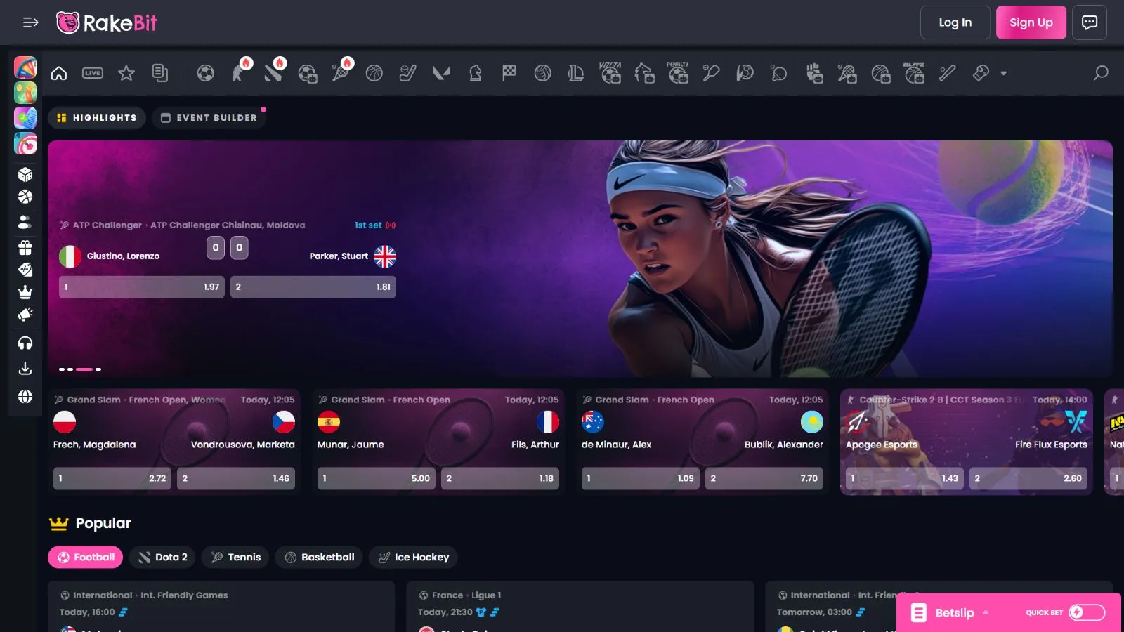 At Rakebit, you can bet on 35+ sports, including the world’s most popular ones like soccer (football), basketball, table tennis, golf, baseball, cricket, rugby, and even American football. Less popular sports such as alpine skiing, pickleball, and Lacrosse are also offered.