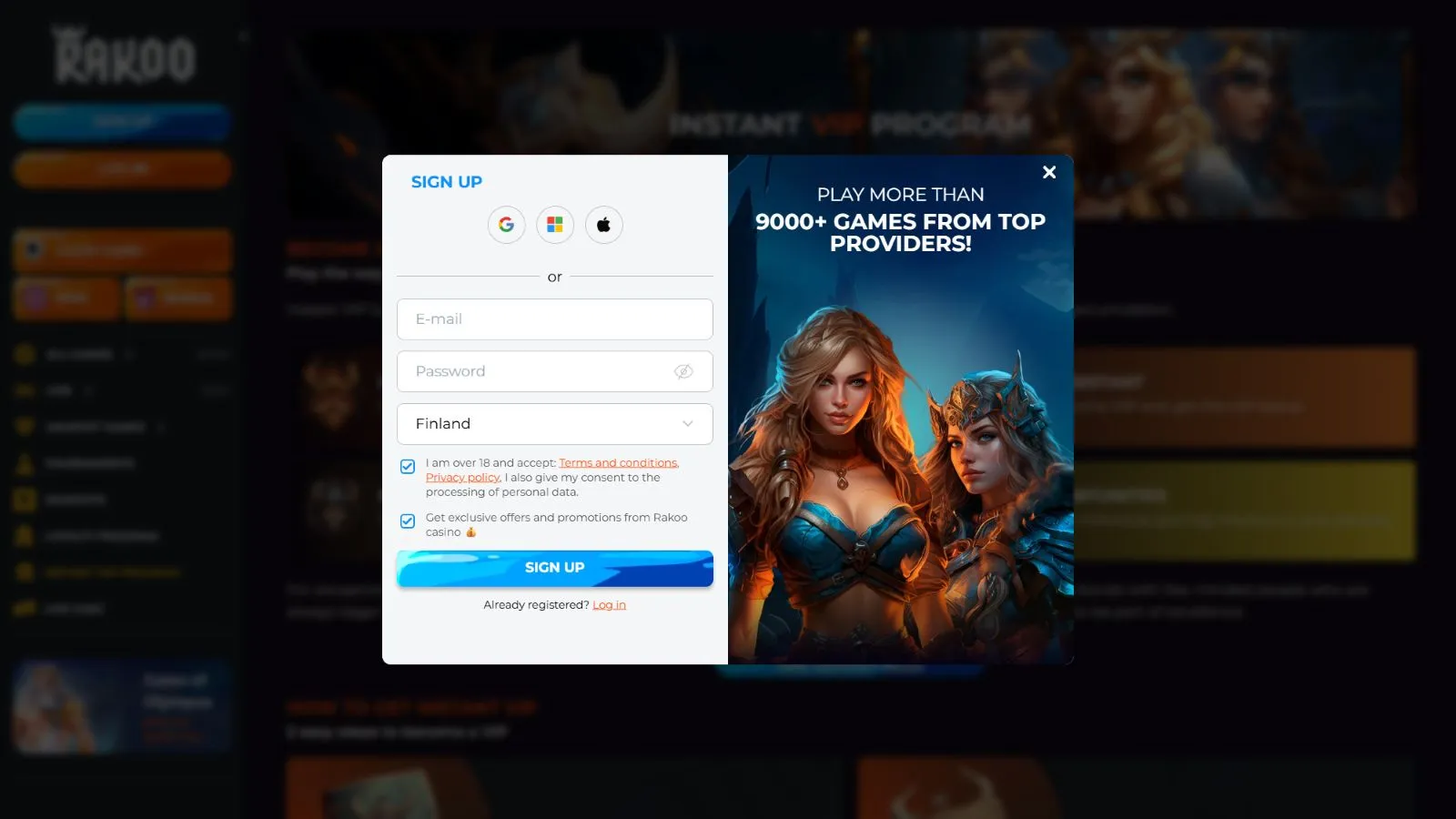 To become a player at Raoo casino, you will have to open an account. First, click on “Sign Up” and fill out the form and then confirm your age and click on the orange “Sign Up” button.