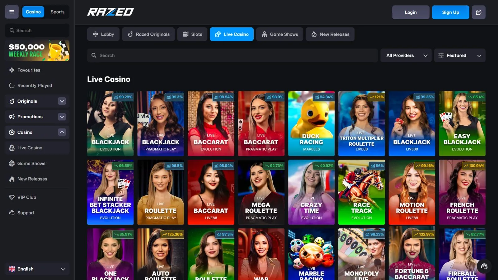 At Razed Casino, players are granted access to about 5000 games in different categories. These casino games are supplied by some of the biggest developers, as well as upcoming providers. They include: