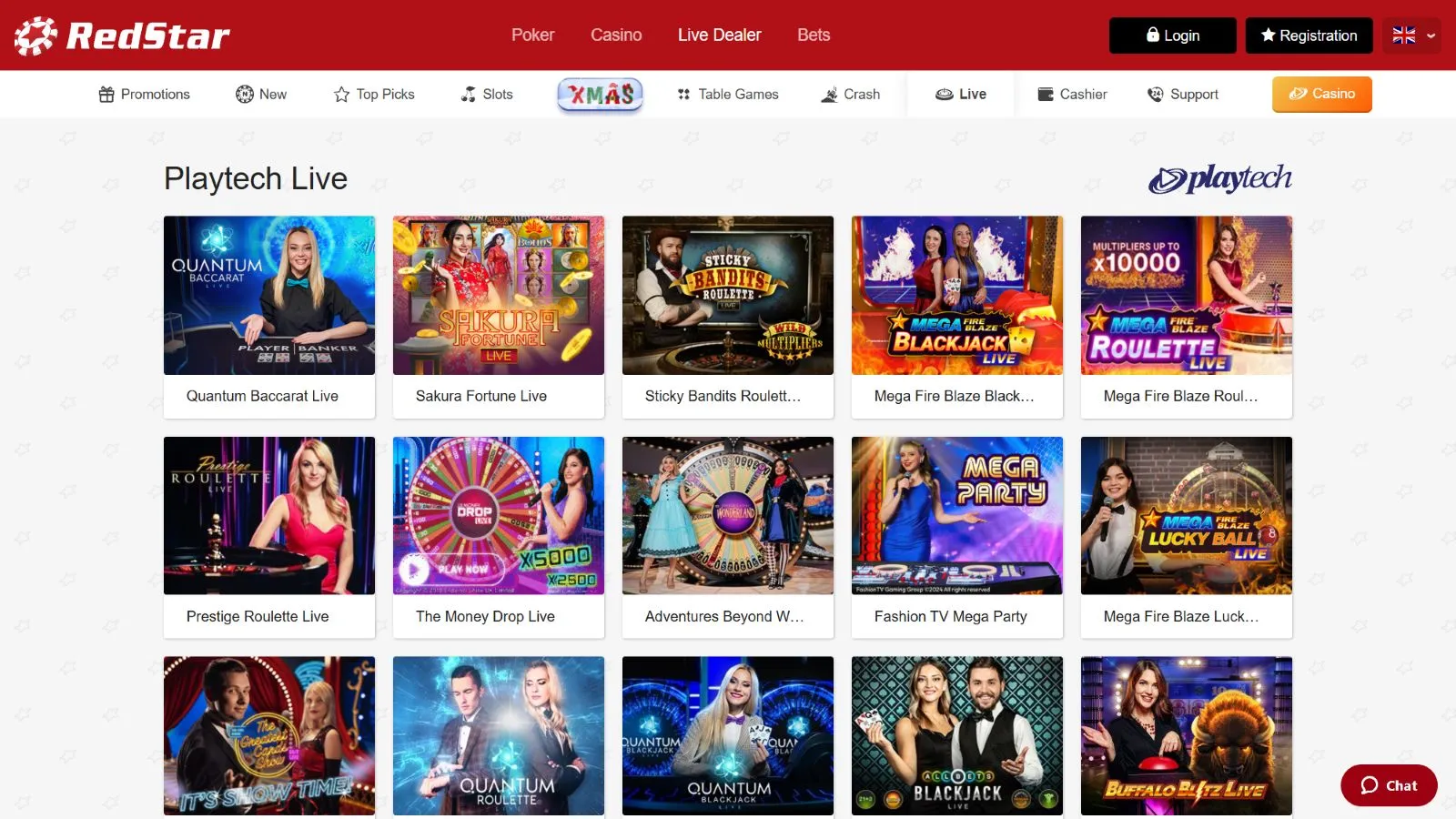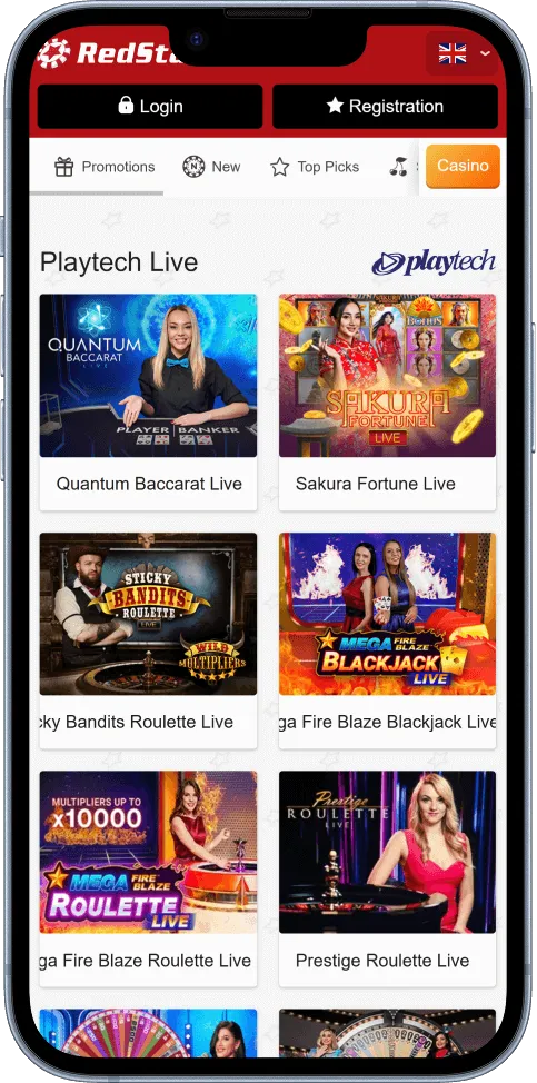 RedStar organizes its live casino section by developers, with Playtech contributing 35+, Pragmatic Play 30+, Evolution 50+, and Ezugi 20+ live games.