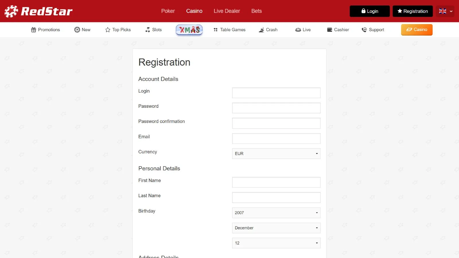 - Visit the Red Star Casino site and tap “Registration”