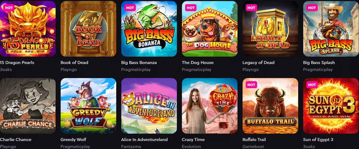 We recommend the following popular slots at Rockwin gambling hub: 15 Dragon Pearls, Book of Dead, Big Bass Bonanza, The Dog House, Legacy of Dead, Big Bass Splash, Charlie Chance, Greedy Wolf, Alice In Adventureland, Crazy Time, Buffalo Trail, Sun of Egypt 3, Wild Cash, Lion Gems: Hold and Win, Aloha King Elvis, Mammoth Peak: Hold and Win, Buffalo Power Hold and Win, and Green Chilli.