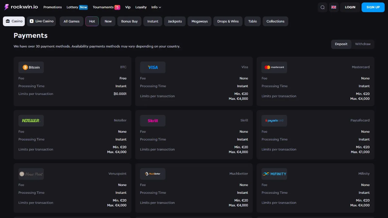 At Rockwin casino, players can expect swift and reliable transactions. Deposits are typically processed instantaneously, allowing players to dive into the action without delay. When it comes to withdrawals, most are processed within a matter of hours. However, players who opt for Visa, Mastercard, or Bank Transfer should note that it might take up to 5 banking days due to the processing times needed for these methods.