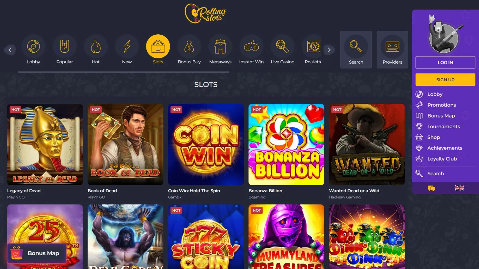 Once you log in to your Rollingslots account, you will see its rich lobby. The casino’s lobby is full of online casino games of all categories. Just below the main slider, you will notice a dozen buttons. These are shortcuts that can be used to find your favorite category. There you can find the newest games, Drops & Wins, Popular, Slots, Roulette, Live Casino, Blackjack, Table Games, and so on. Also, there are games like baccarat, poker, sic bo, and many live shows, but we will leave these for later.