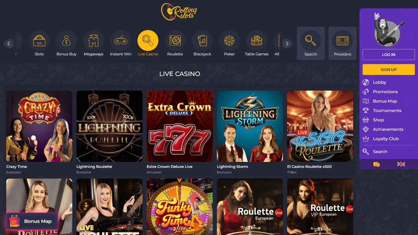 The easiest way to get to the Live Casino section at Rolling slots casino is by clicking on the Live Casino button that can be found in the center of the lobby. This section is for those of you that prefer to play against real humans instead of playing versus machines, or playing slots.