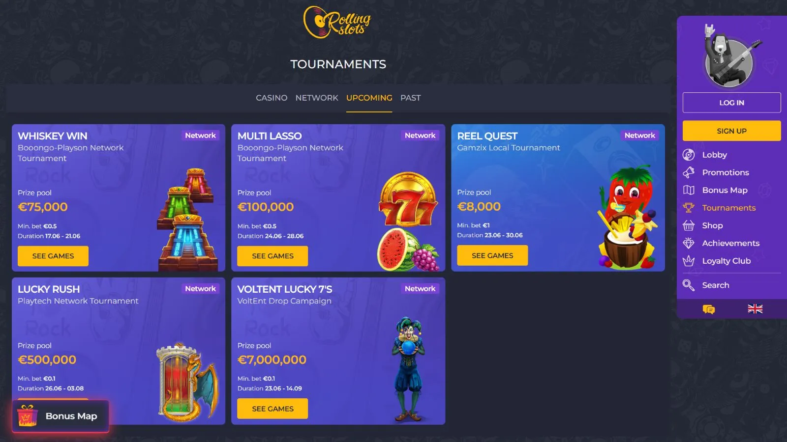 To be honest, we really like the cartoonish design of Rolling slots casino. The carpet-like background in the upper part and the creative animations are giving a good boost of positivity, and that’s something you’ll need when playing casino games. From the menu on the right, you can access their promotions, the shop, their tournaments, loyalty club, achievements, and also see your current bonuses.