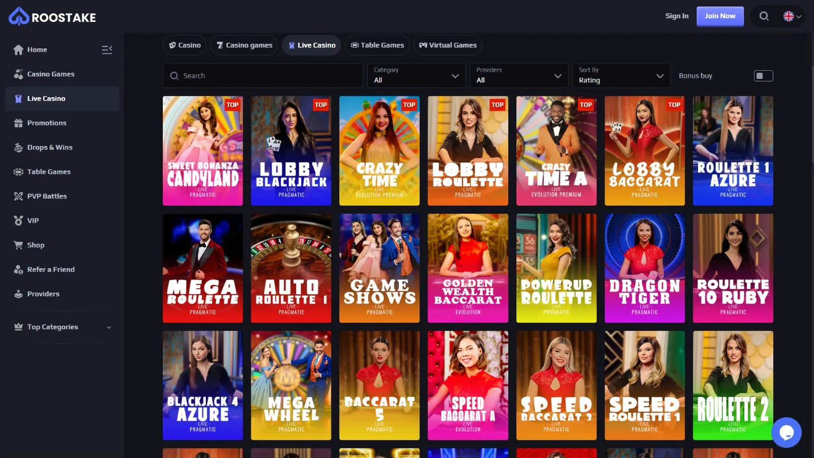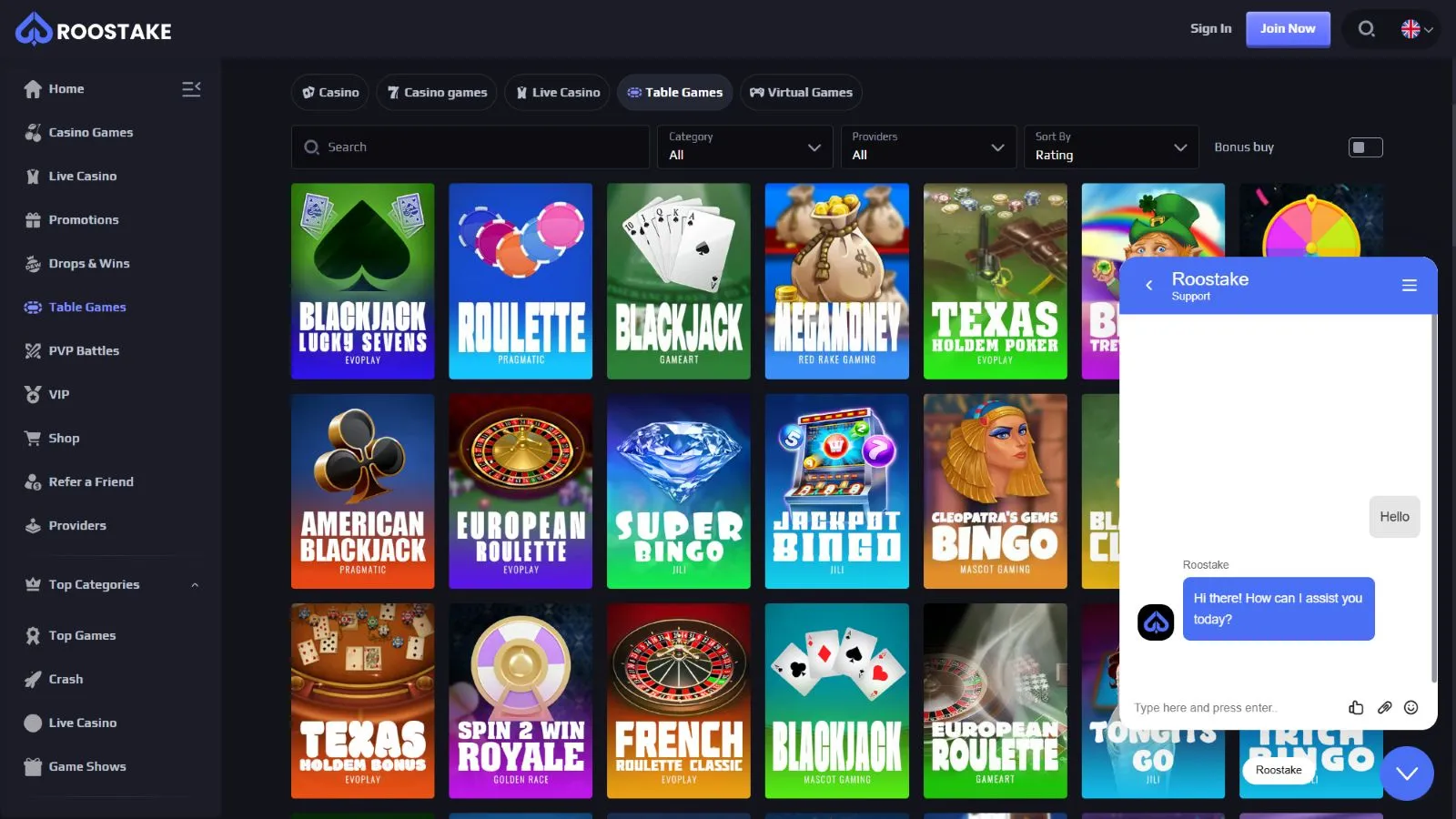 Roostake Casino Games and Providers