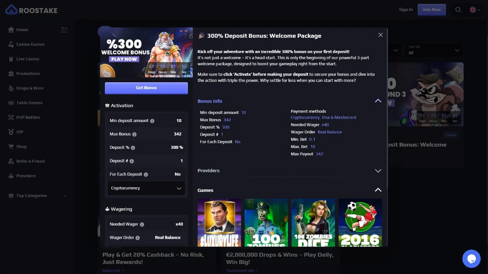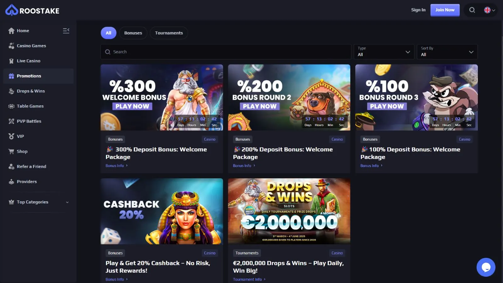 This section reviews all the major Roostake Casino bonuses and promotions.