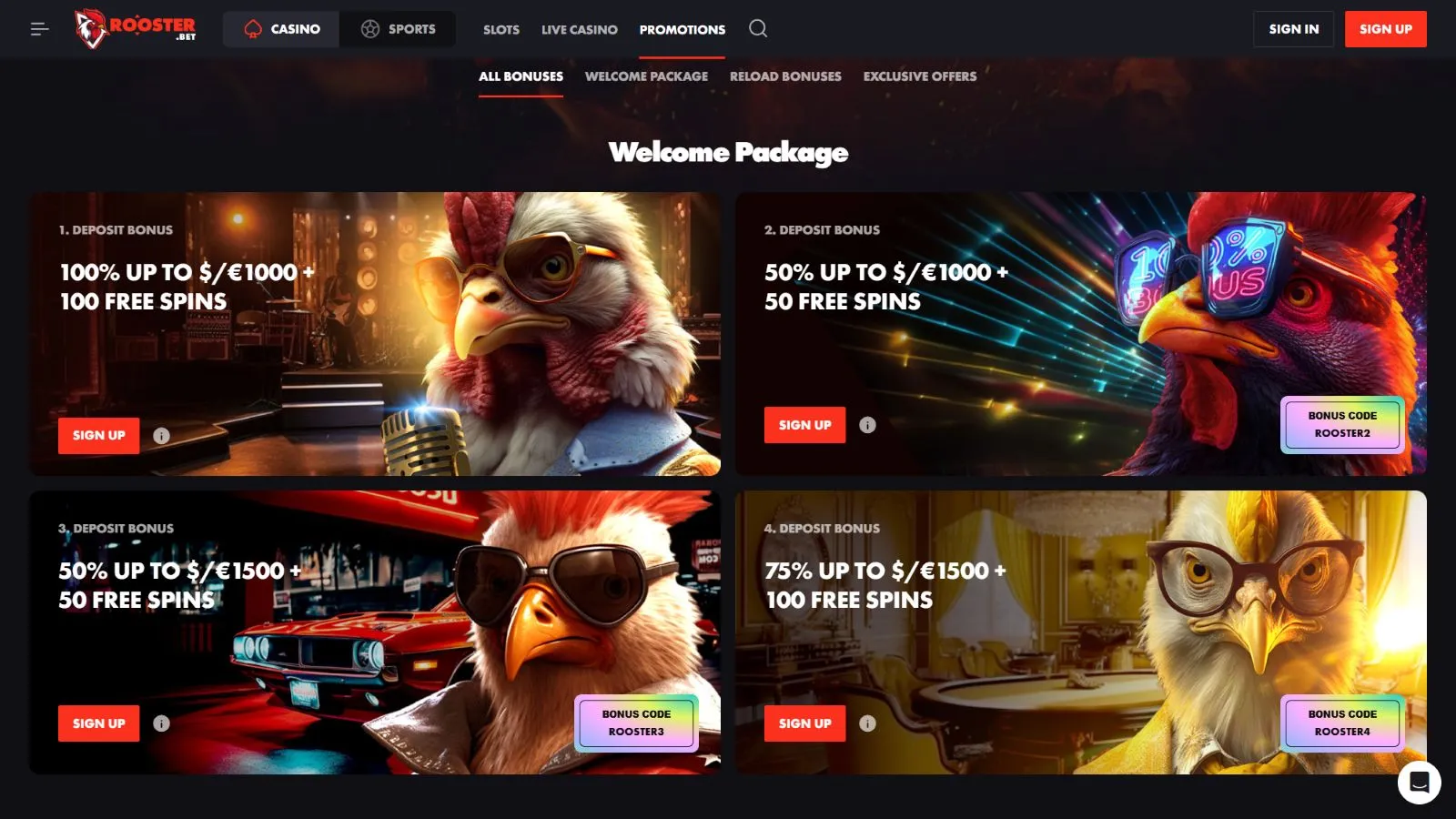 Rooster Bet offers enough bonuses for both casino gamers and sports bettors on its site. After the welcome bonuses, users get the chance to claim reload deals at least twice during the week.