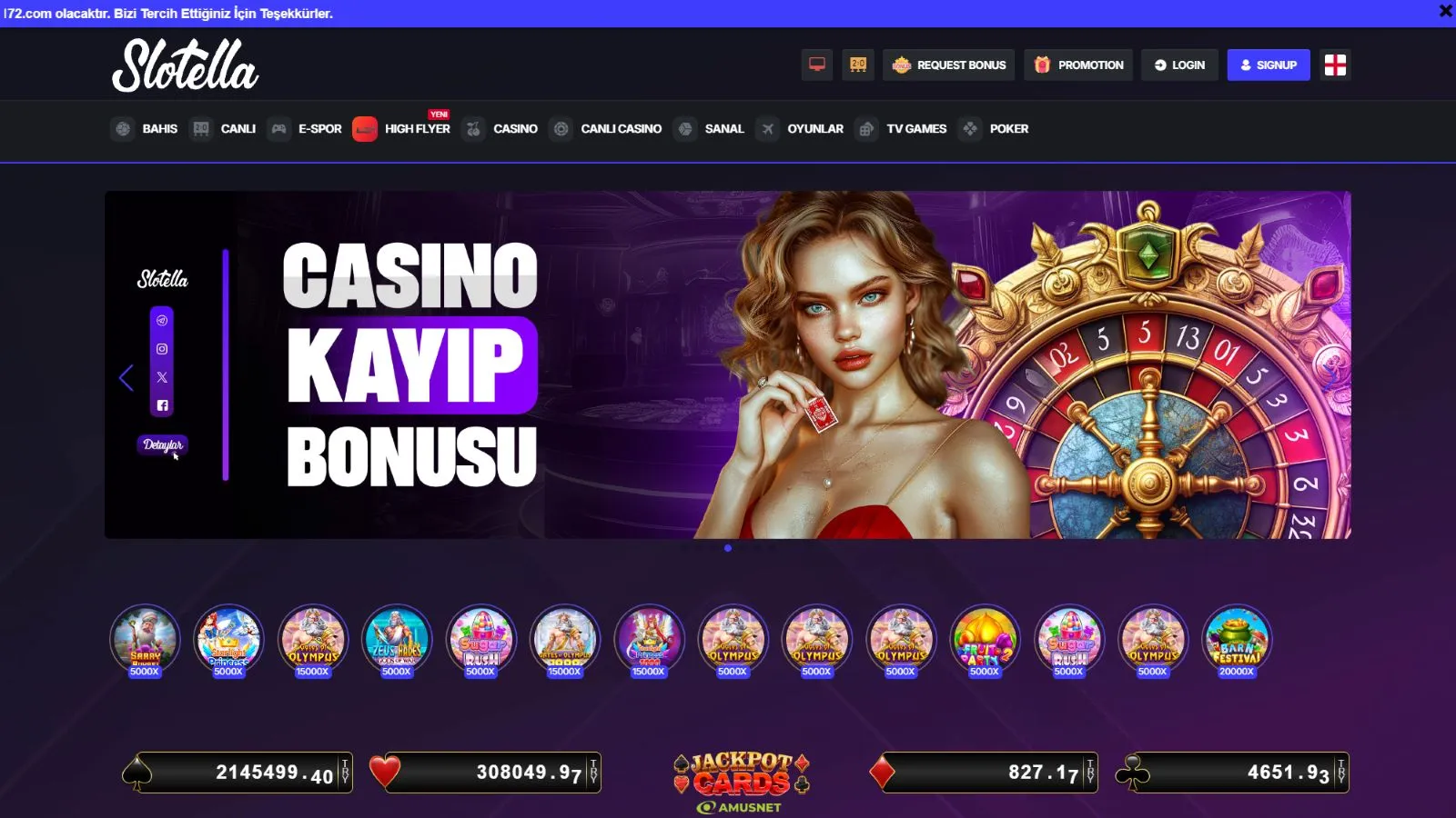 On its homepage, there is a big slider with details about the promotions that you can scoop. Additionally, you can even see the top winners and the latest bets in real-time! You can change the casino language from English to German, Spanish, French, Portuguese, Russian, Japanese, Georgian, Chinese, Turkish, and Arabic. If you want to start following Slotella casino on its social networks, look for the “Follow Us” category at the footer.