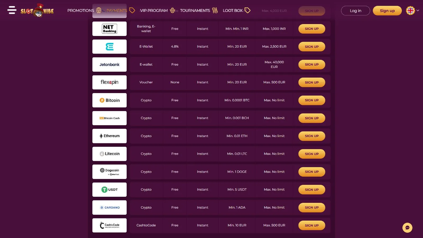 SlotVibe casino not only supports crypto deposits but also supports various FIAT options. This way, nobody is left out no matter what banking method you’re using to fund your player account. The casino supports the following withdrawal and deposit options:
