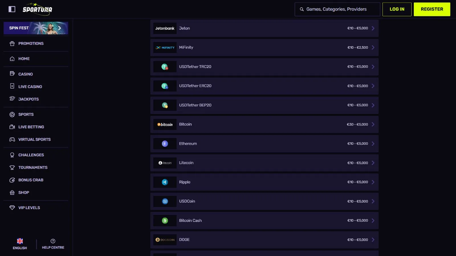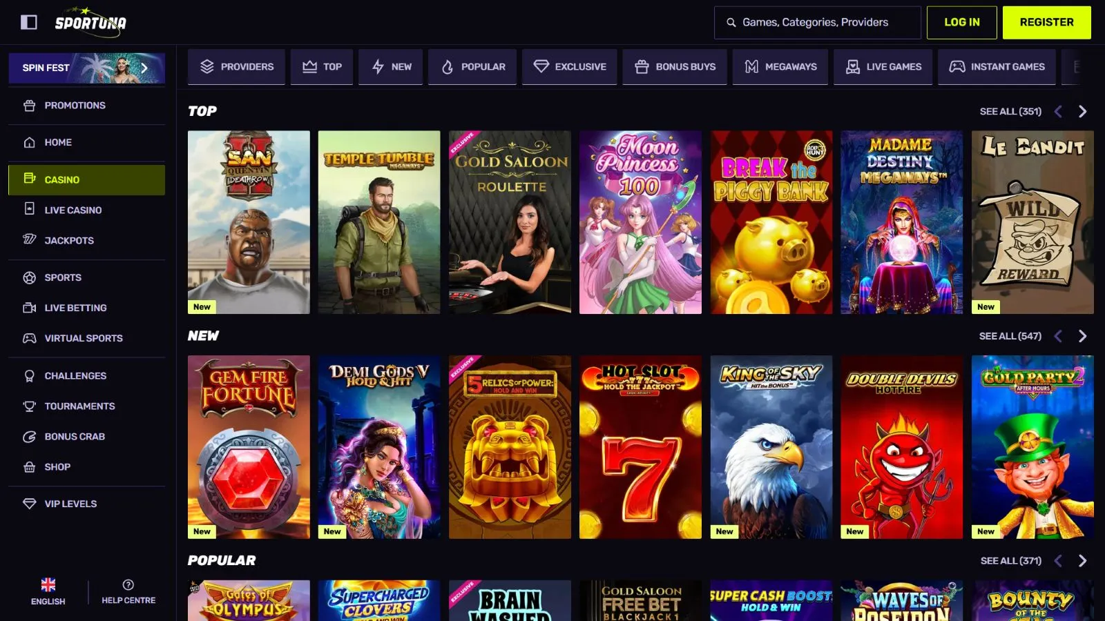 Sportuna casino thoughtfully equips its platform with user-friendly tools to make game selection easy for players. The top menu houses a search filter for quick access to specific games. Furthermore, the casino tabs categorize games for easier browsing, and a comprehensive list lets you cherry-pick games from your preferred game studio.