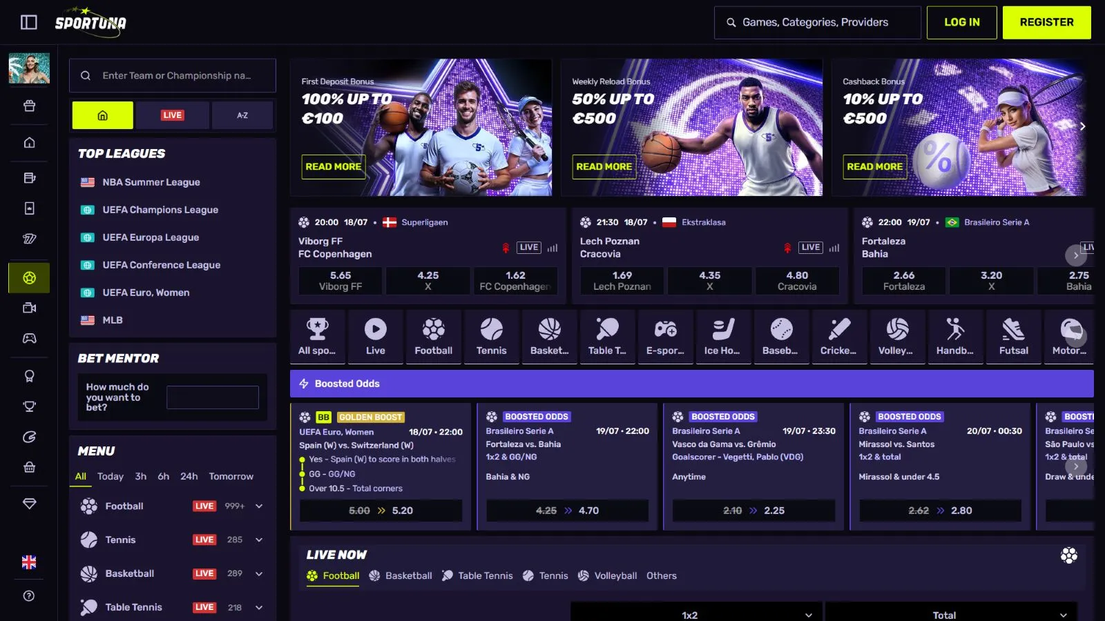 A notable addition to Sportuna casino is its integrated sportsbook. This offers you a seamless way to jump into sports betting while you play your favorite casino games. Begin your sports betting journey by clicking on the “Sport” button positioned in the left-side sub-menu of the homepage. You can wager on a broad spectrum of sports, including Tennis, Basketball, American Football, Volleyball, Motorsports, MMA, E-Sports, Football, Table Tennis, and Baseball. What’s more, Sportuna casino provides live match betting, virtual sports and even horse racing options.