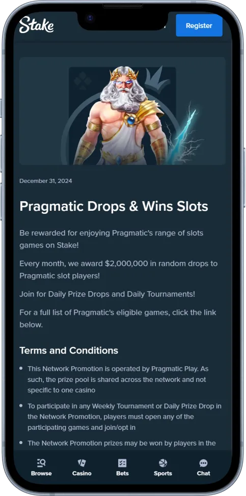 The Pragmatic Drops & Wins Slots promotion at Stake Casino provides players with a chance to win a share of $2,000,000 per month by playing Pragmatic’s extensive list of slot games. This monthly promotion distributes prizes to players based on their performance in the eligible games, making every spin potentially lucrative.