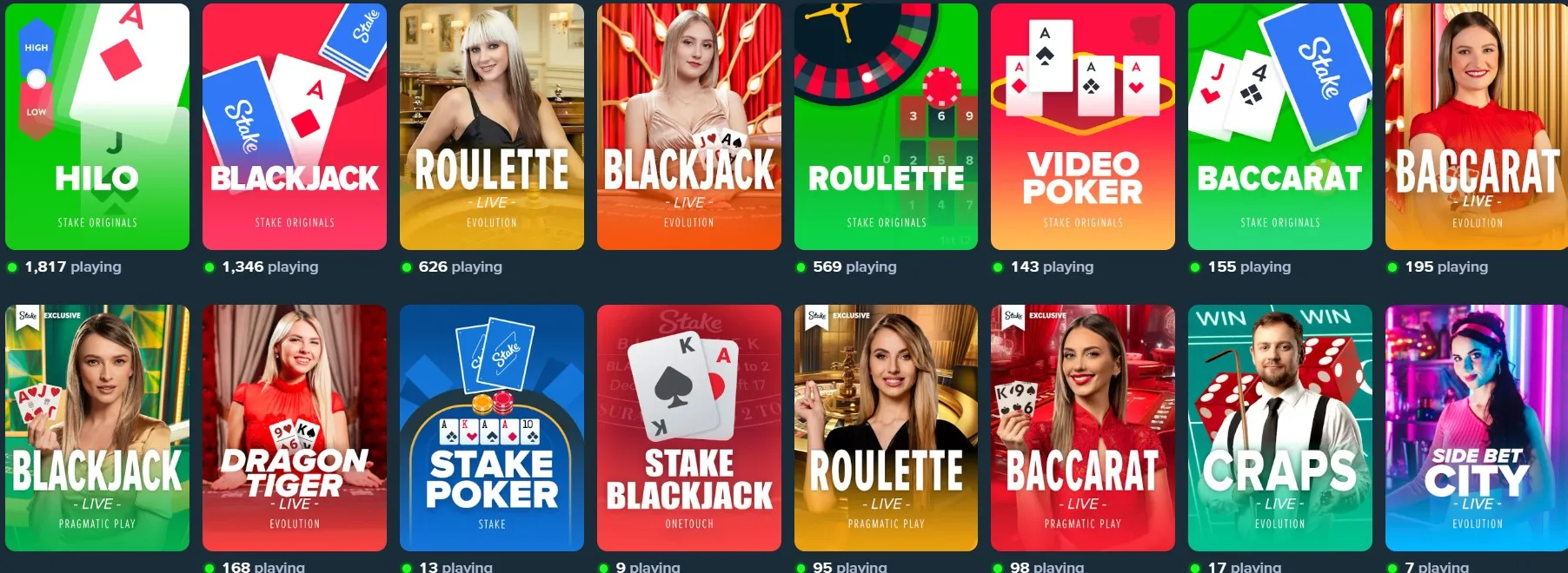 Table games are highly popular in online gambling. Stake Casino offers an extensive collection of classic table games, including: