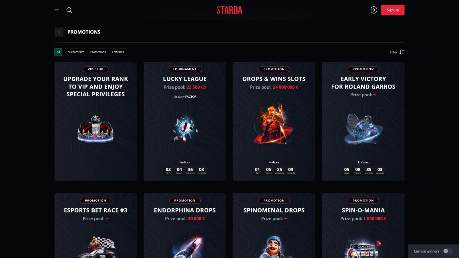 If you love competing for prizes with other players, Starda Casino is a suitable destination. The casino offers regular tournaments and events with massive cash prizes. Whenever you switch to the tournaments page, you’ll always find an ongoing or upcoming event to join.