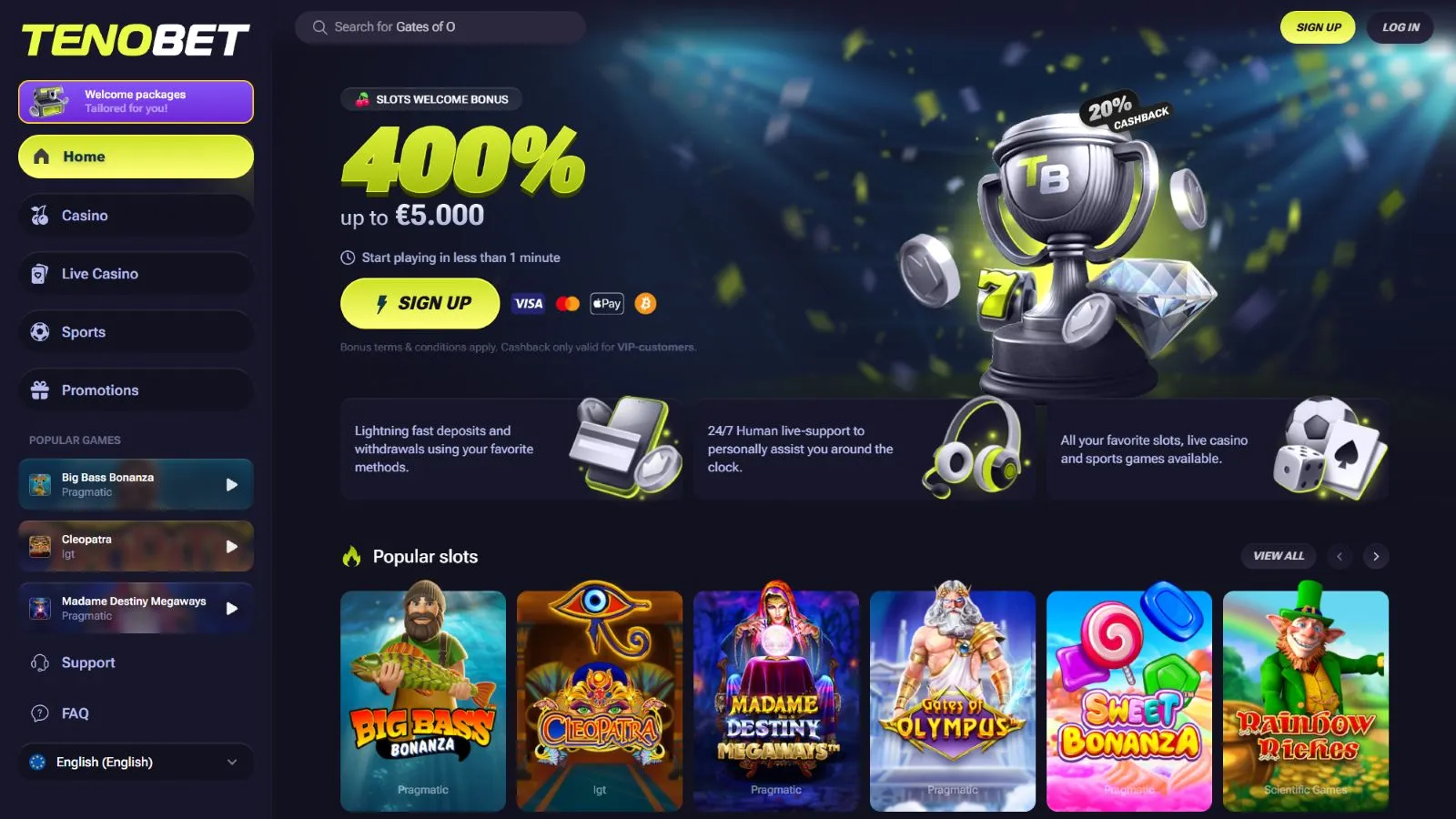 TenoBet Casino packs a serious punch for players who want to enjoy massive bonuses and a versatile slot and live gaming experience. It clearly aims to boost your bankroll with its welcome package and weekly reload bonuses.