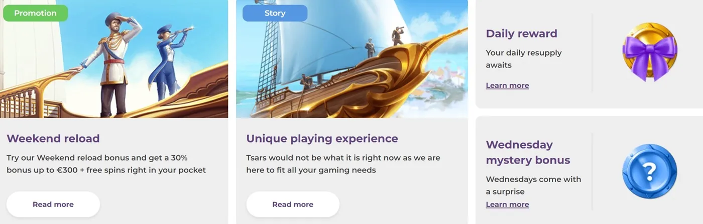 At Tsars, there are several bonuses that you can use in order to get maximize your chance of winning when playing. The welcome offer consists of 4 different bonuses with a total value of €2,000 + 200 Free Spins. Then there are daily reward bonuses, Wednesday mystery bonuses, and weekend reload bonuses that will give you boosts through the week so you can be having a great experience on Tsars. This crypto-friendly casino lacks the traditional Loyalty Scheme, but the more you play, the bigger daily rewards and mystery bonuses you will receive!