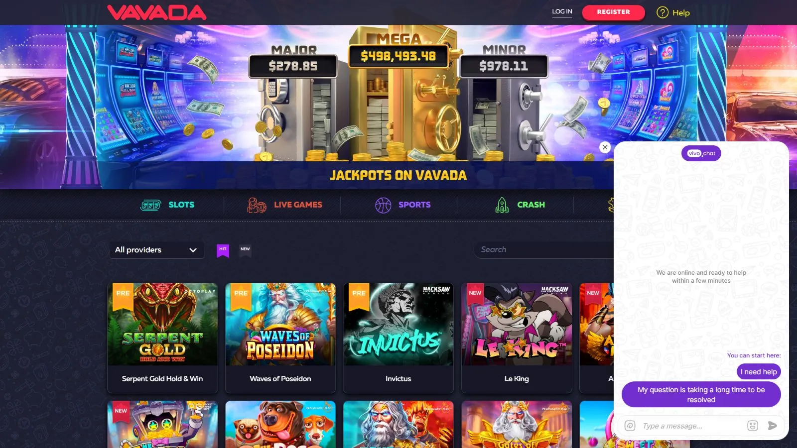 On the homepage, you will see a huge slider on which will be displayed the best Vavada offers. Below it, there will be the 3 game categories (slots, live casino, table games) and the tournaments button, which will take you to the Tournaments page. If you want to get help, click on the “Help” button in the top menu and start speaking with the live chat bot.