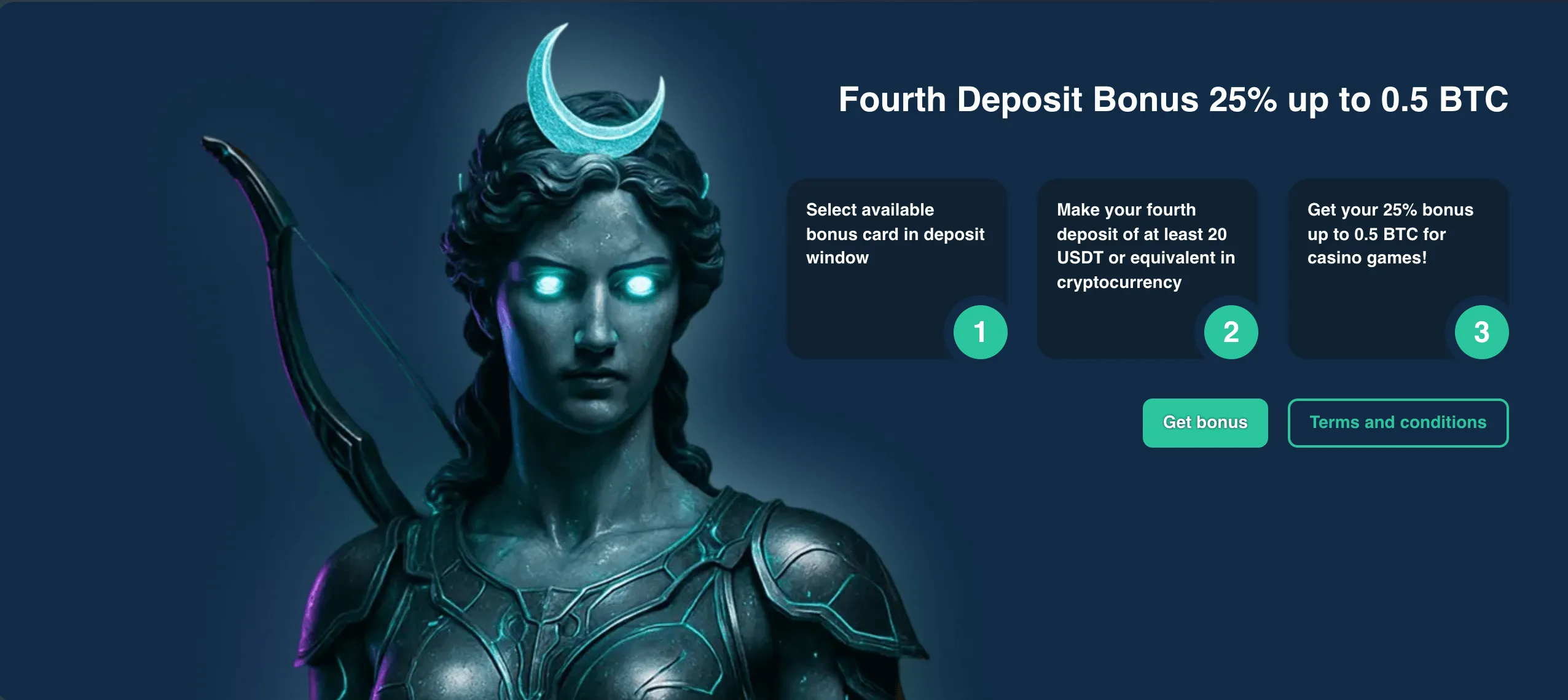 - 4th Deposit Bonus – 25% up to 0.5 BTC