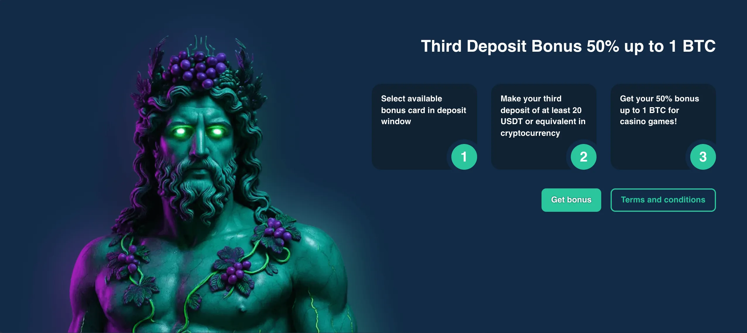 - 3rd Deposit Bonus – 50% up to 1 BTC
