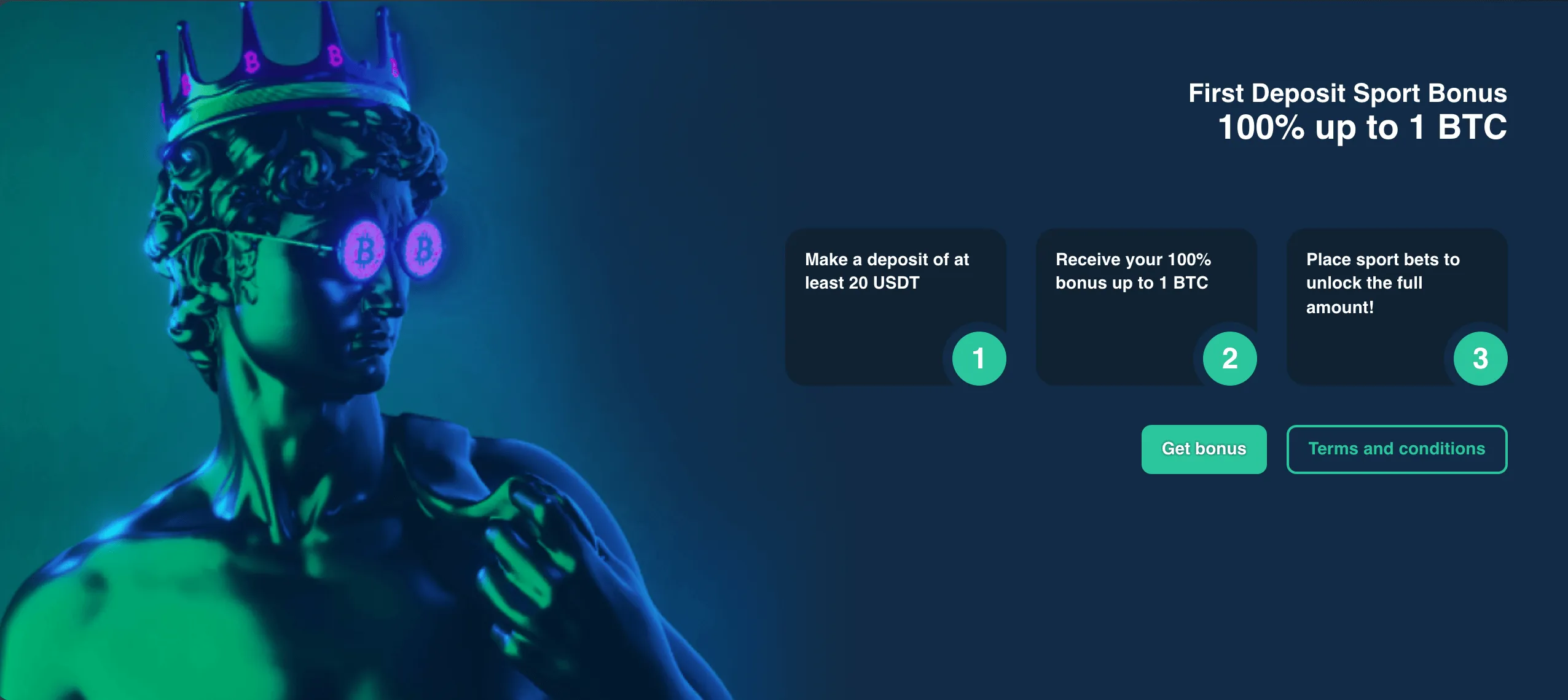 Just make your first deposit of 20 USDT or more, and you’ll receive a 100% sports bonus up to 1 BTC. The bonus amount is credited in installments, depending on your total wagering activity.