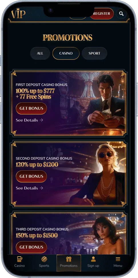 Every new month, VIPCasino allows you to claim 77% up to $777 + 77 free spins for casino games once. The bonus requires a $50 minimum deposit and must be activated in the “My Bonuses” section.