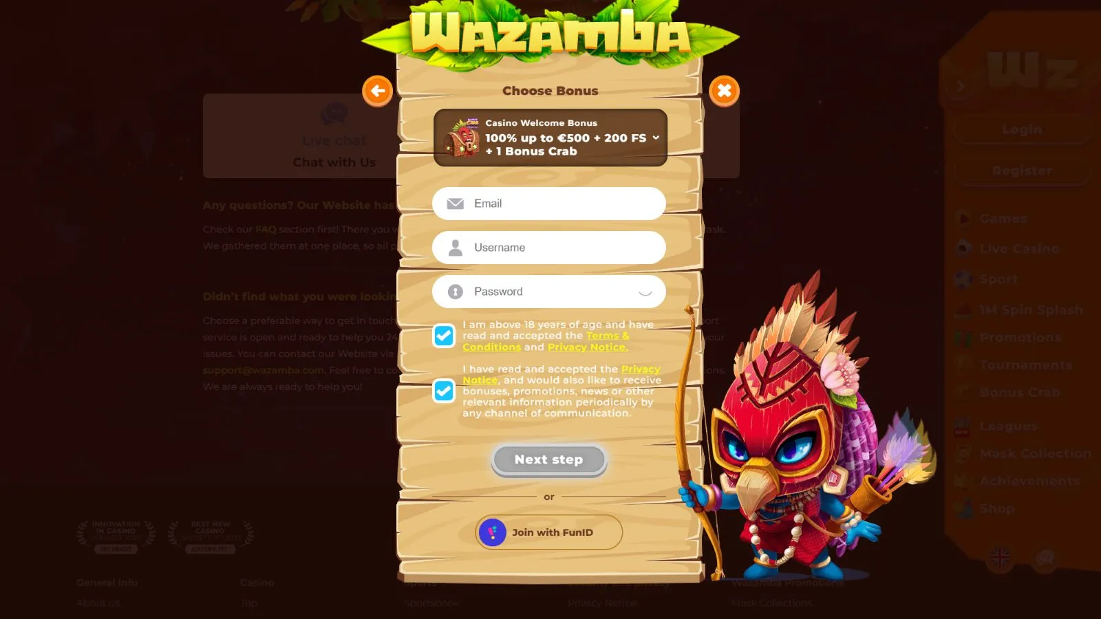 Wazamba casino made the registration process pretty interesting because every new player will have to select one of the three available avatars Advar, Bomani, or Chimola. Then, enter your username, email address, set a password, and you are ready to go. If you have a promo code, you can enter it by clicking on the “I have a promo code” button.