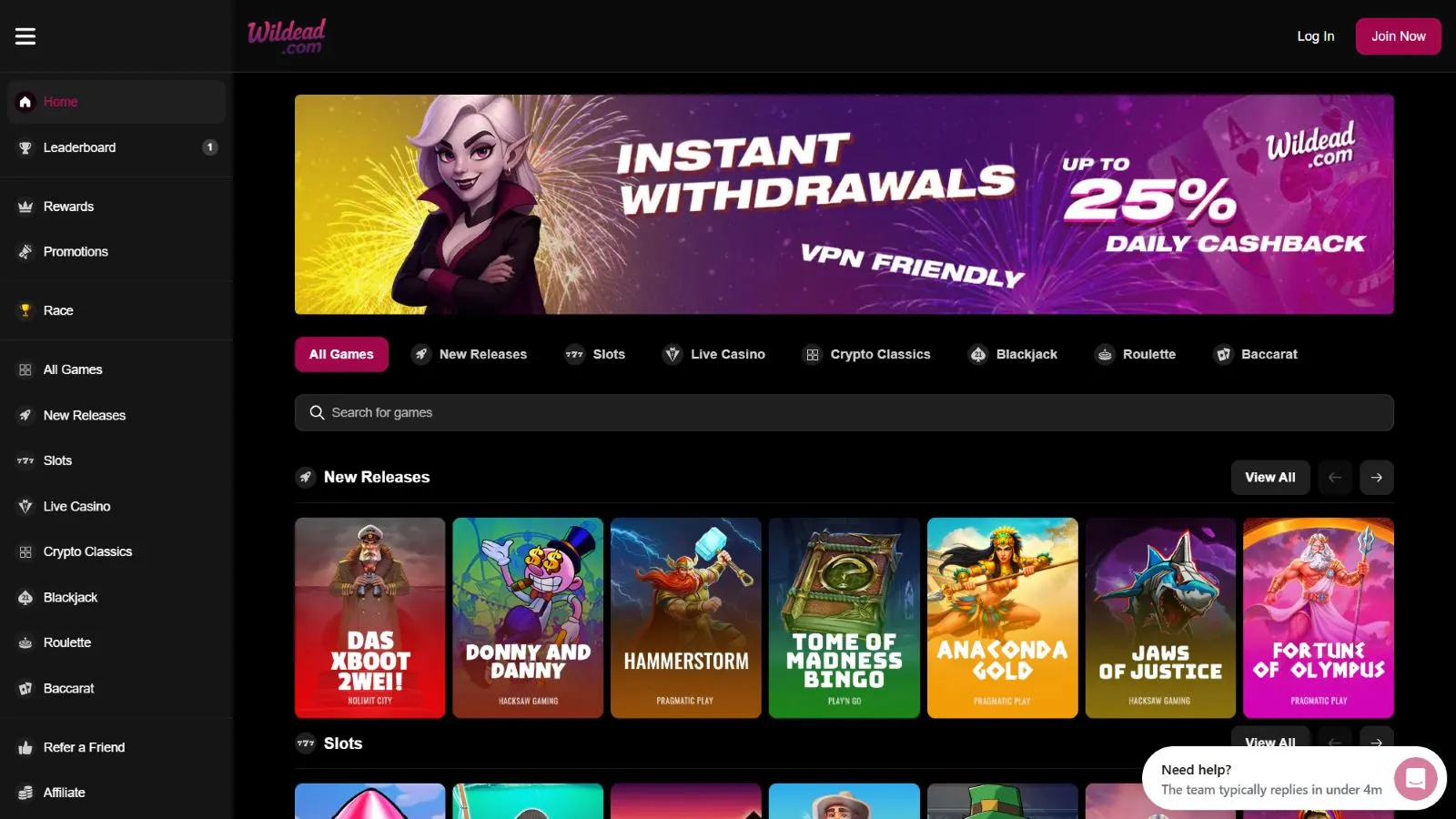 Wildead is a crypto casino where bonuses keep flowing in. From its solid welcome offer to cashbacks, rakebacks, and exclusive reload deals, there’s so much to enjoy. You also get top-notch VIP perks and bonuses.