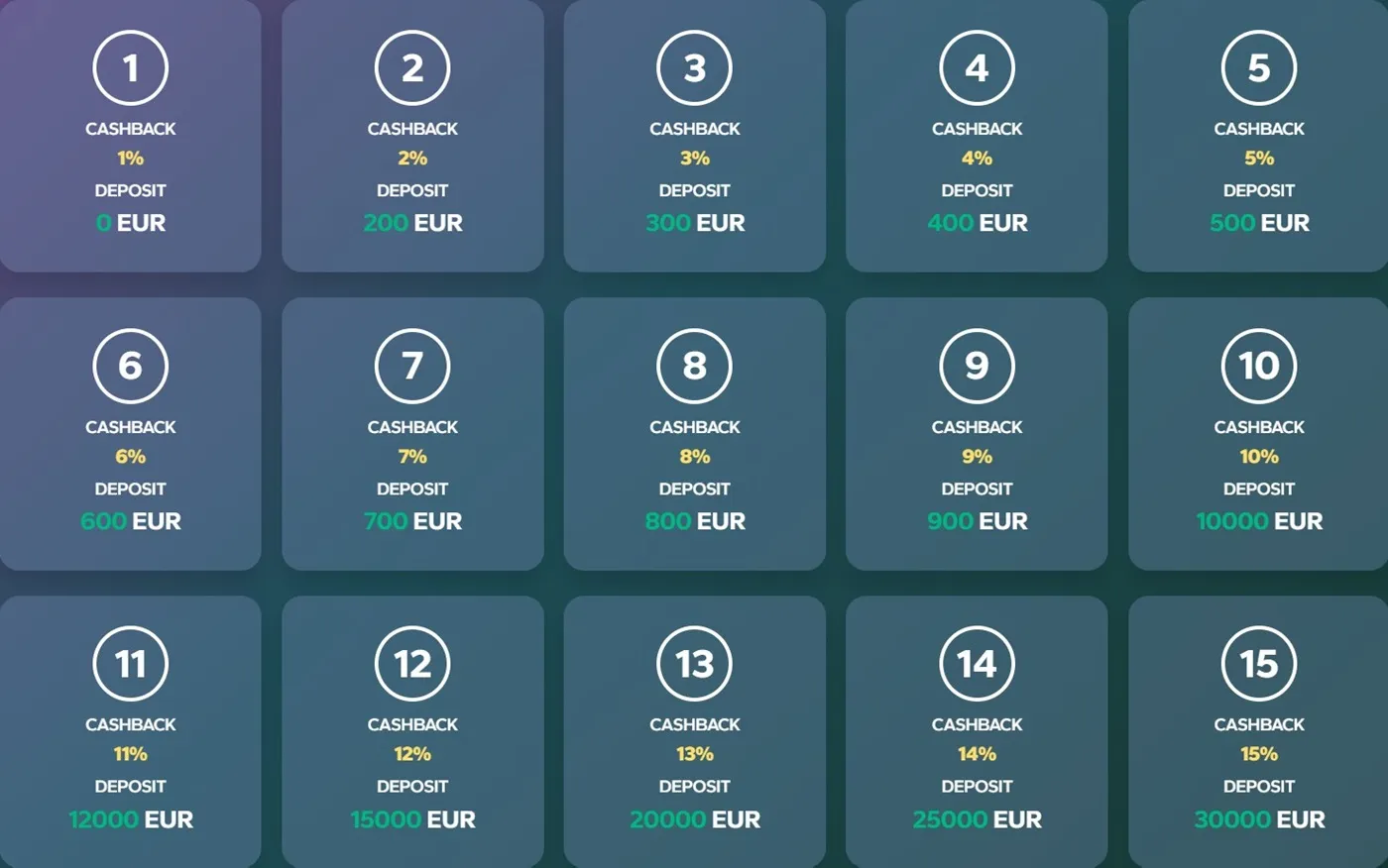 Once you achieve the Master level, you will have a 20% Cashback, Tornado points multiplicator of 1.5x, a max bet of 10 EUR, and there will be no need for a deposit turnover.
