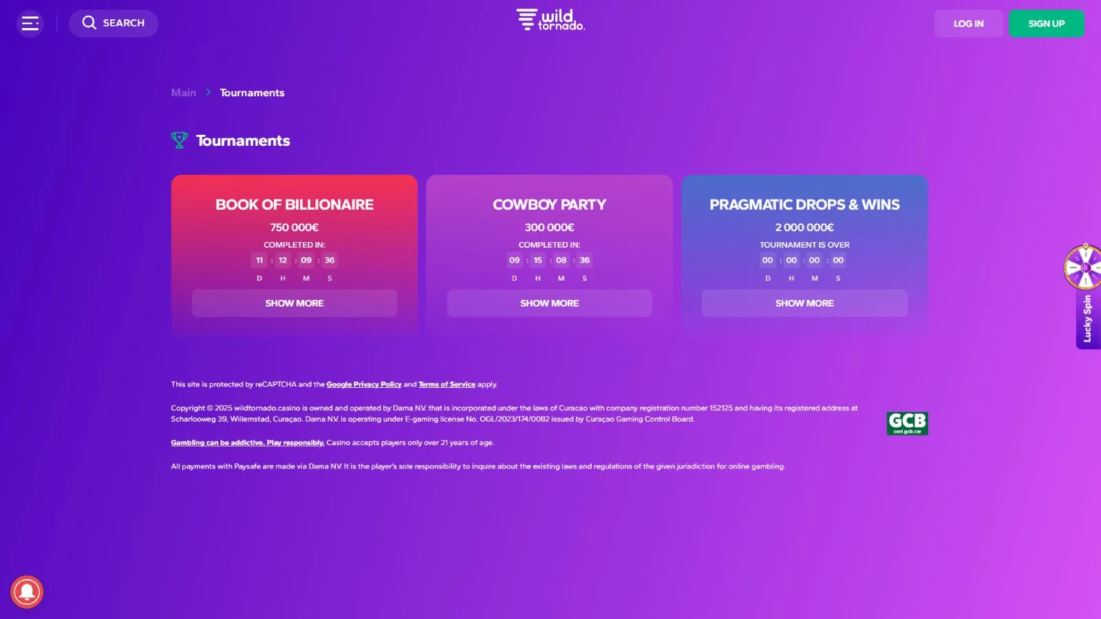 Wild Tornado Casino has all the rights to host all kinds of gambling activities on its site because it is owned and operated by Dama N.V., a company that is registered and licensed under Curacao laws.