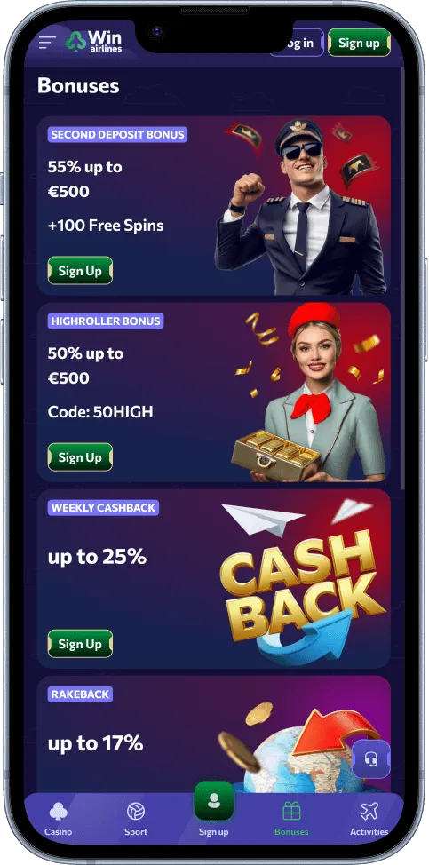 Every three days at WinAirlines, you get the chance to claim 50% up to €500 in bonuses. Deposit at least €300 using the code 50HIGH Copied , and the bonus will be credited to your account.