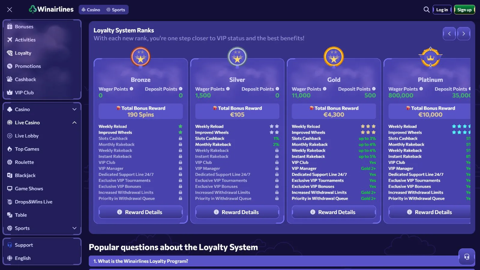 | Platinum | 800,000 WP, 35,000 DP | €10,000 | 5% | 5% | 5% | 8% | VIP ClubDedicated supportVIP ManagerIncreased withdrawal limitsFaster withdrawals |