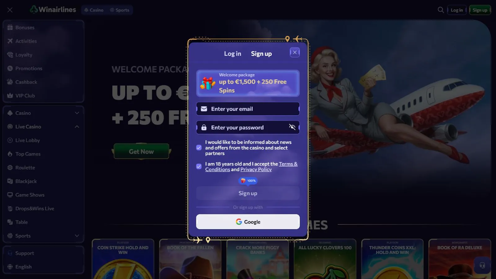 - Visit the Win Airlines Casino site and click on the “Sign Up” button